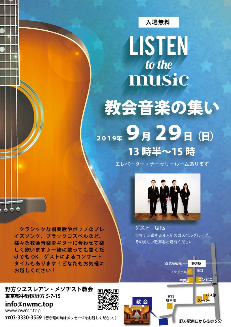 クラシックな讃美歌やポップなプレイズソング、ブラックゴスペルなど、様々な教会音楽をギターに合わせて楽しく歌います♪一緒に歌っても聞くだけでもOK。ゲストによるコンサートタイムもあります!どなたもお気軽にお越しください!